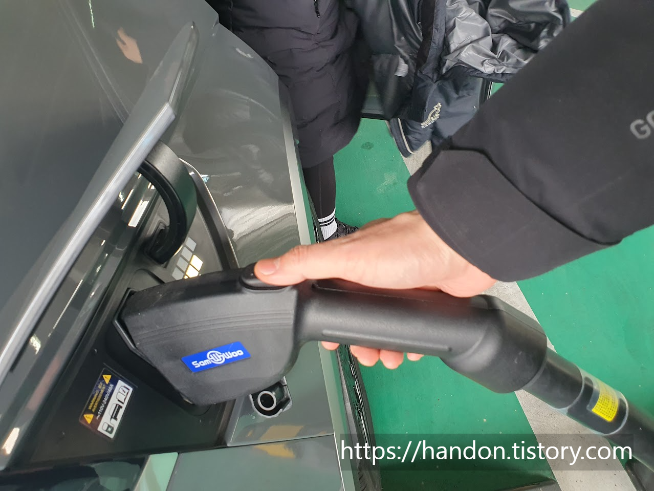 7. 충전 완료 후 내 차에서 빼고 충전기에 다시 꼽아 넣을 때는 반대의 순서로 한다! (버튼은 꼭 누르고)